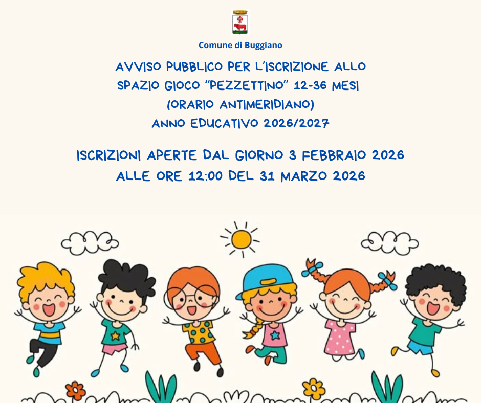 SI INFORMA che dal 3 febbraio sono aperte le iscrizioni al servizio Spazio Gioco “Pezzettino” per i bambini d'età compresa dai 12 ai 36 mesi (compiuti nella data di presentazione dell'iscrizione). Il Servizio è gratuito ed è aperto in orario antimeridiano (senza pasto) indicativamente dalle 8 alle 12.