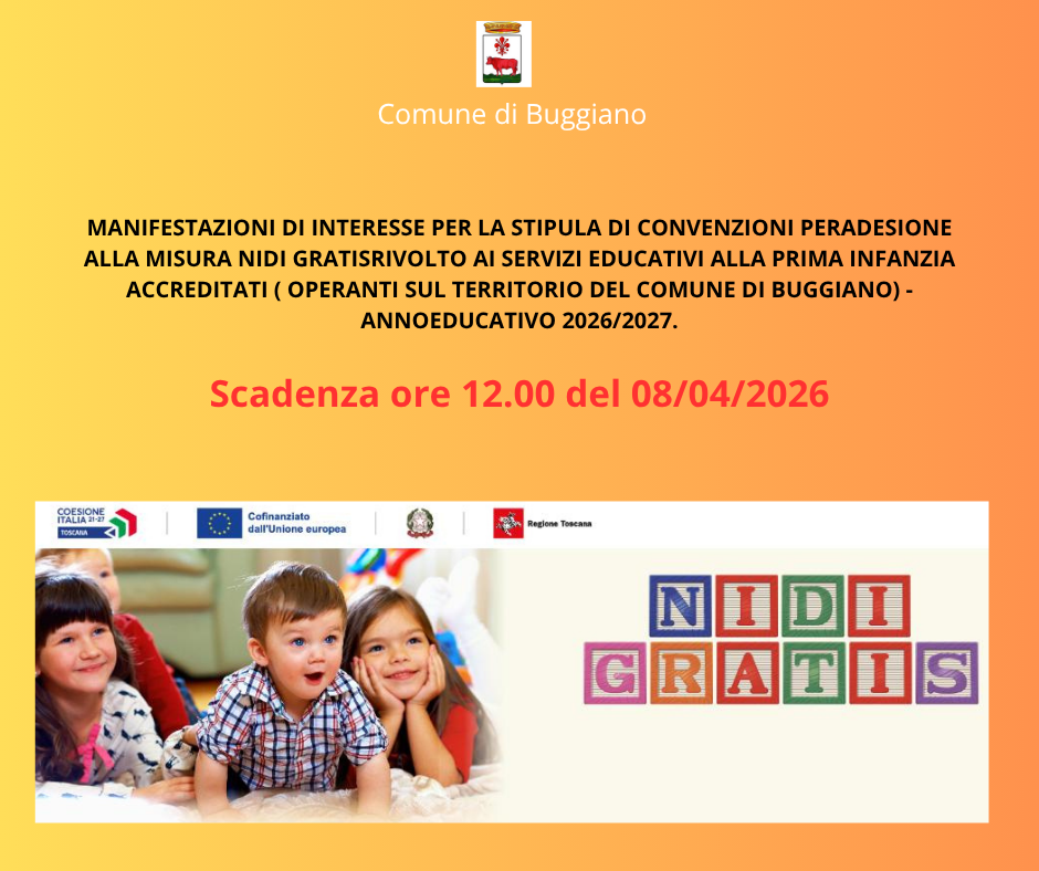 AVVISO PUBBLICO PER L'ACQUISIZIONE DI MANIFESTAZIONI DI INTERESSE PER LA STIPULA DI CONVENZIONI PER ADESIONE ALLA MISURA NIDI GRATIS (DECRETO DIRIGENZIALE REGIONE TOSCANA N. 4545 del 05/03/2026 e ss.mm.ii.) RIVOLTO AI SERVIZI EDUCATIVI ALLA PRIMA INFANZIA ACCREDITATI (NIDI D'INFANZIA E SPAZI GIOCO) OPERANTI SUL TERRITORIO DEL COMUNE DI BUGGIANO - ANNO EDUCATIVO 2026/2027.