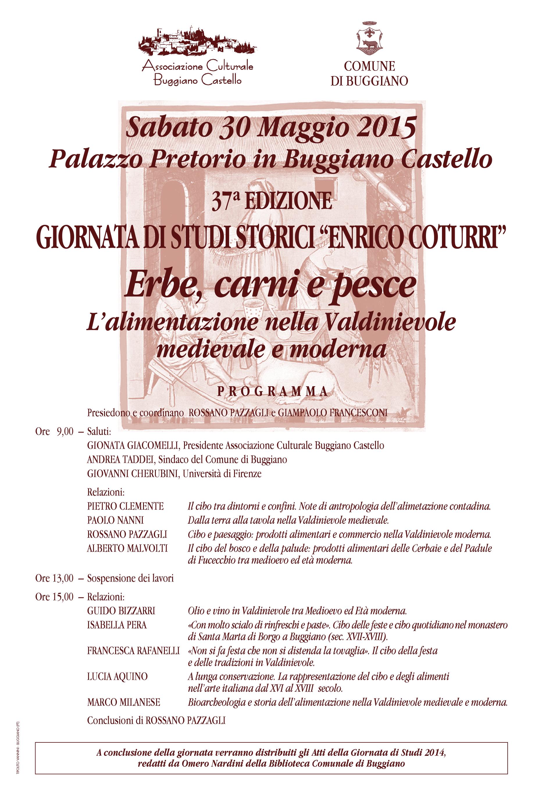 Sabato 30 maggio, a partire dalle ore 9.00, si terrà nel Palazzo Pretorio di Buggiano Castello la 37^ edizione del Convegno di studi storici sulla Valdinievole, organizzato dall'Associazione culturale Buggiano Castello ed il Comune di Buggiano, dal tema "ERBE, CARNI E PESCE: L'ALIMENTAZIONE NELLA VALDINIEVOLE MEDIEVALE E MODERNA".