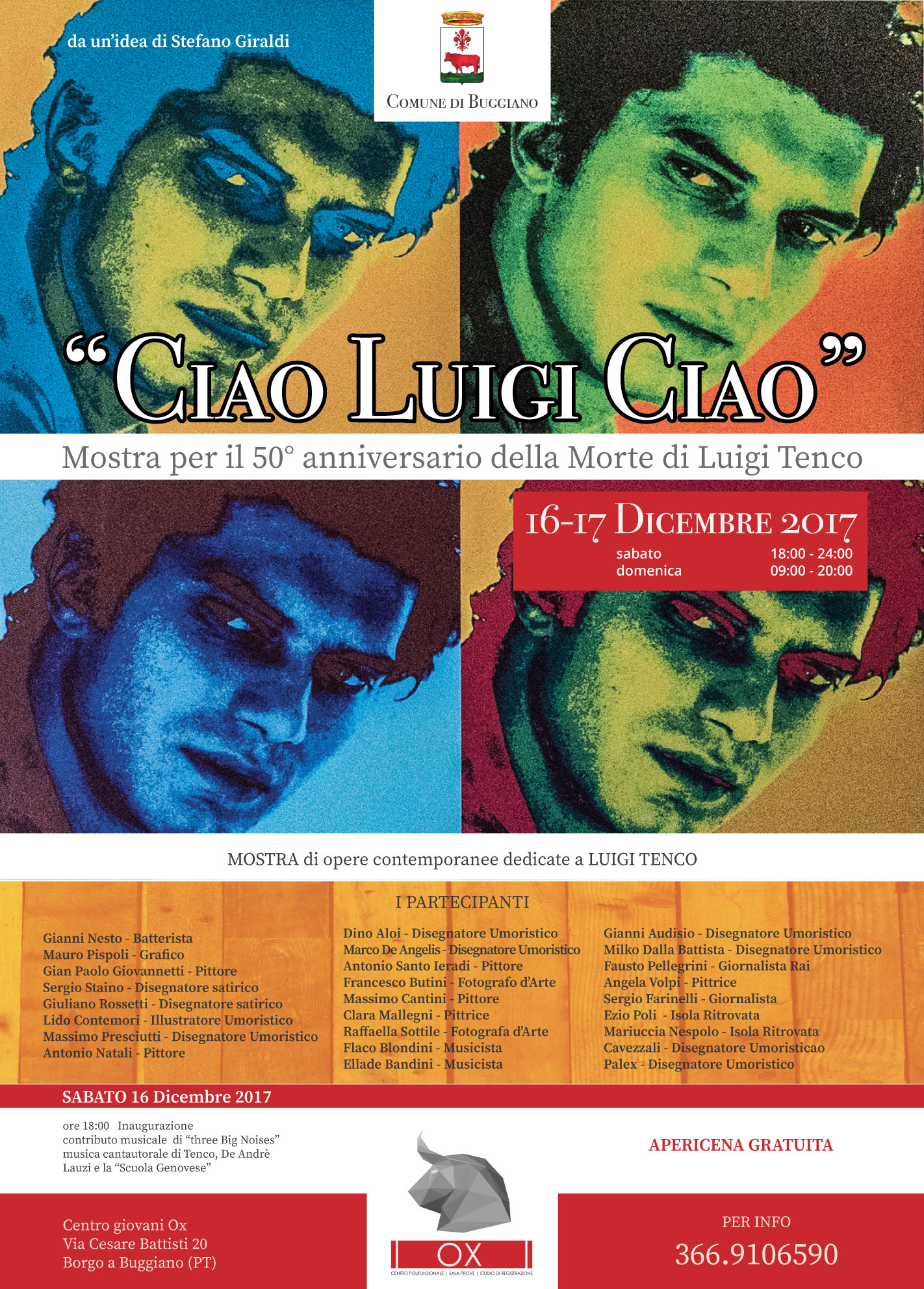 Sabato 16 dicembre e domenica 17 dicembre presso il Centro Giovani OX, Via C. Battisti, Borgo a Buggiano, si terrà una mostra di opere contemporanee dedicate a Luigi Tenco, in occasione del 50° anniversario della morte del cantautore.