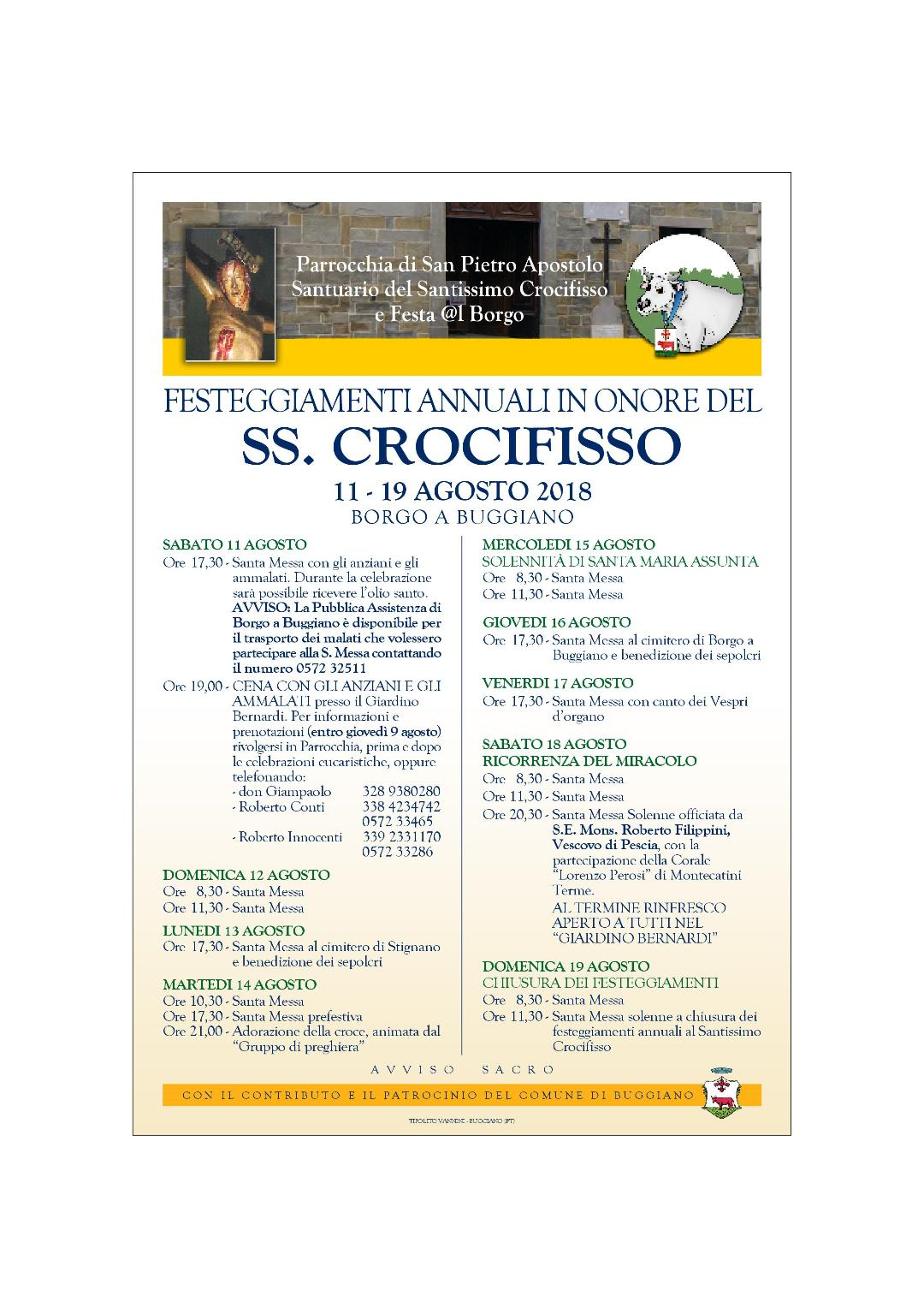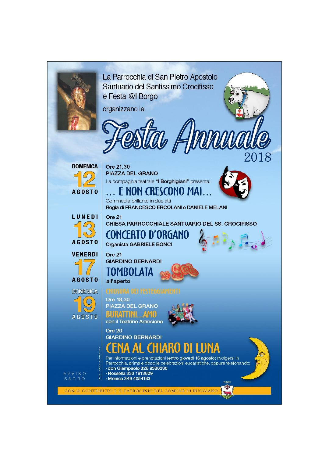 La parrocchia di San Pietro Apostolo-Santuario del SS. Crocifisso di Borgo a Buggiano e l'associazione Festa @l Borgo, con il patrocinio ed il contributo del Comune di Buggiano, organizzano la FESTA ANNUALE: