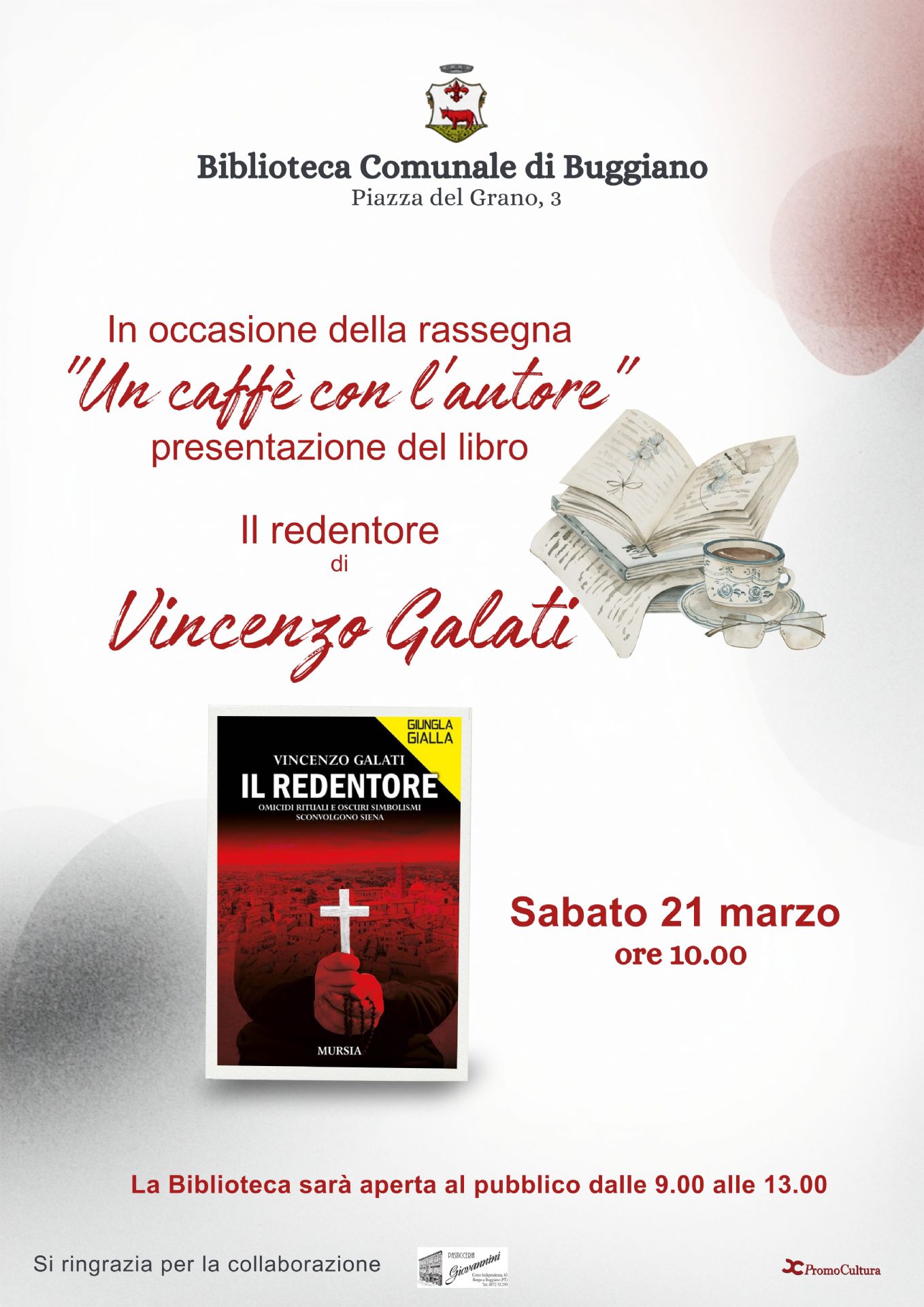 In occasione della rassegna "Un caffè con l'autore" sabato 21 marzo alle ore 10 in biblioteca Vincenzo Galati presenterà il suo libro" Il redentore". Seguirà un piccolo rinfresco con caffè e pasticcini.