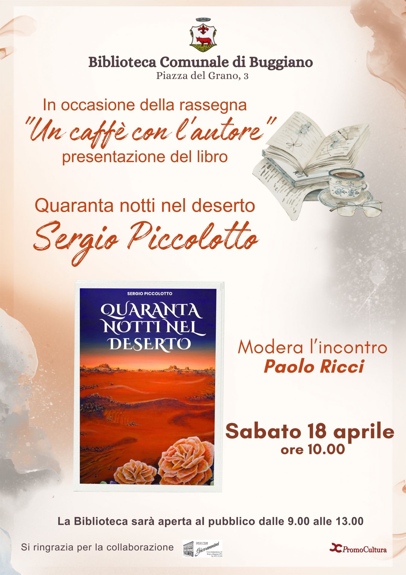 Ulimo incontro della rassegna "Un caffè con l'autore". Sabato 18 aprile alle ore 10 in biblioteca, Paolo Ricci presenterà il libro "Quaranta notti nel deserto" di Sergio Piccolotto. Seguirà un piccolo rinfresco con caffè e pasticcini.